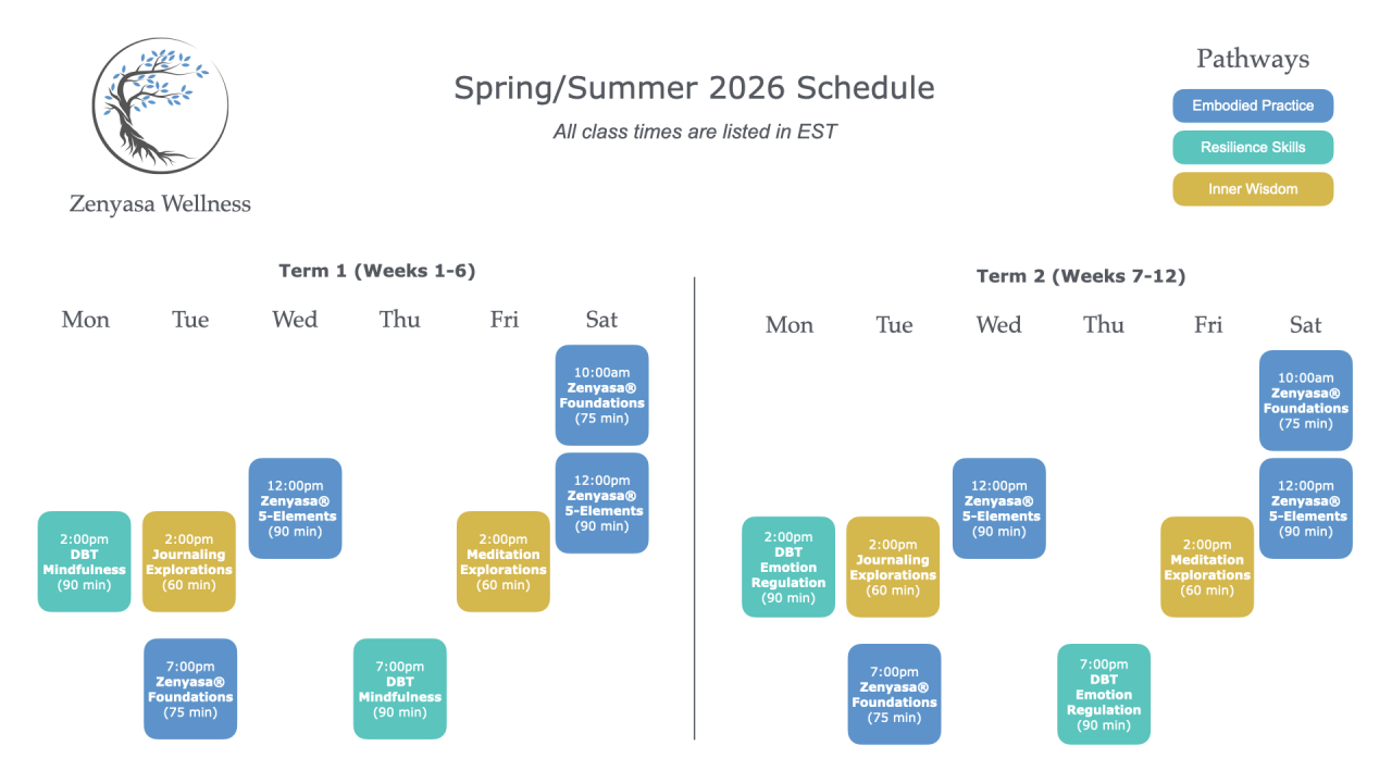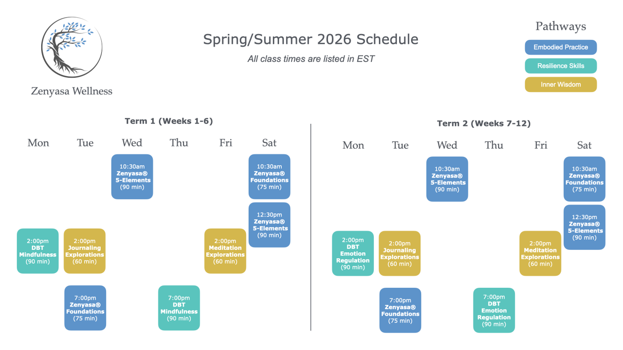 Each semester at Zenyasa Wellness follows a clear 12-week seasonal rhythm, divided into two 6-week terms. This rhythm gives you enough structure to build consistency — and enough spaciousness to learn, practice, and integrate.